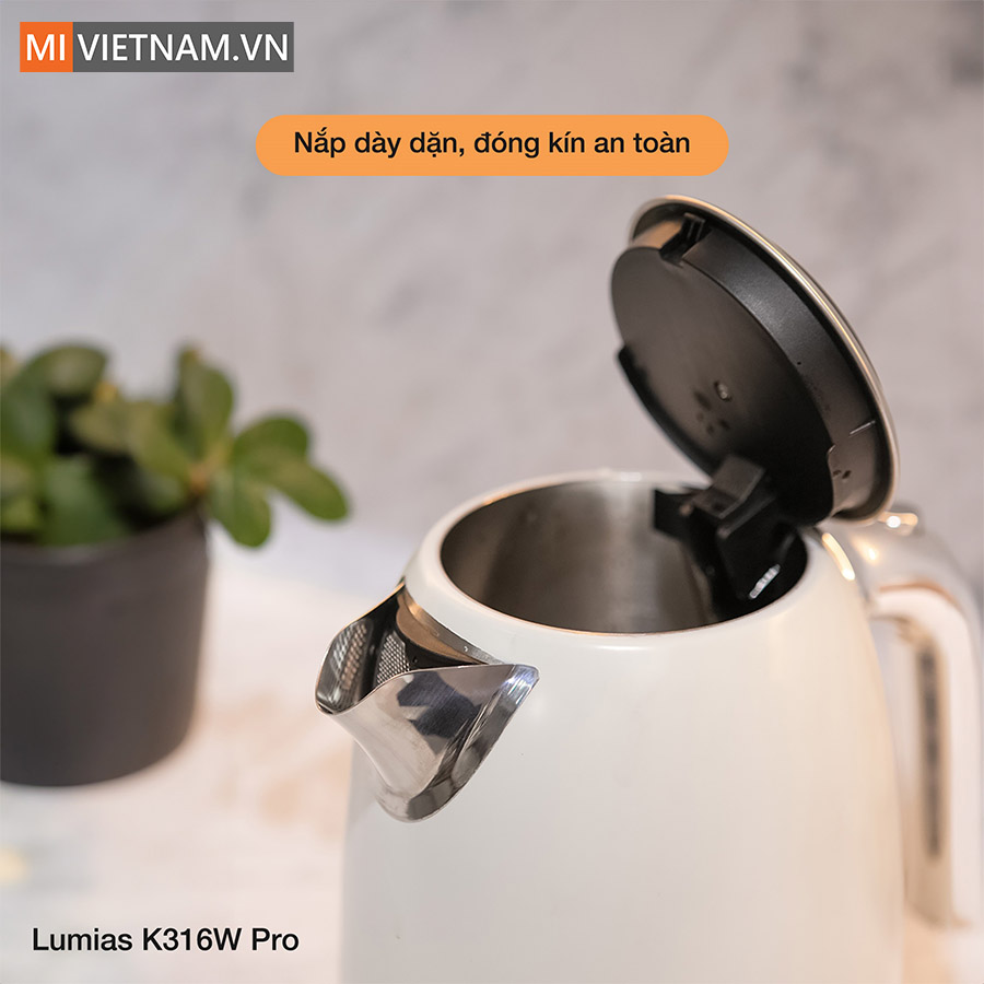 Lumias K316W Pro gây ấn tượng với gam màu trắng thanh lịch, tạo điểm nhấn sang trọng cho gian bếp. Nắp ấm có thể tháo rời giúp việc vệ sinh dễ dàng hơn, hạn chế cặn bám lâu ngày. Thân ấm tích hợp thang đo mực nước rõ ràng, giúp người dùng định lượng nước chính xác, tiết kiệm thời gian và điện năng. Tay cầm bọc cách nhiệt tạo cảm giác chắc chắn và an toàn khi rót nước nóng.