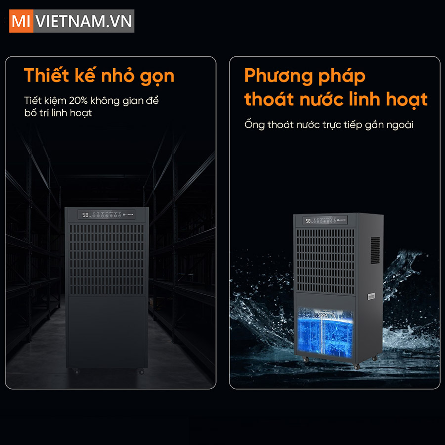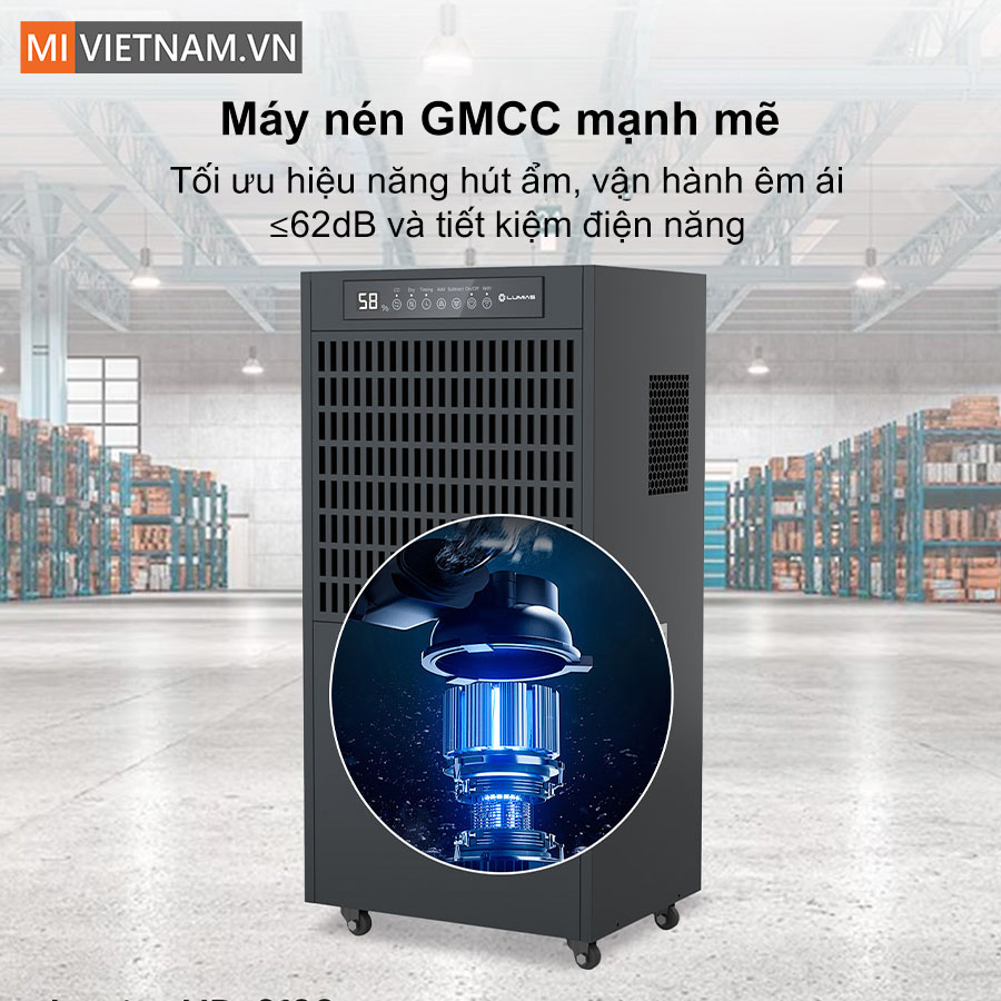 Thiết bị sử dụng máy nén GMCC mạnh mẽ, mang lại khả năng xử lý ẩm nhanh nhưng vẫn duy trì độ ồn ở mức thấp chỉ ≤62dB. Nhờ đó, môi trường làm việc trong kho xưởng hay khu sản xuất luôn dễ chịu, không bị ảnh hưởng bởi tiếng ồn lớn khi máy hoạt động liên tục. Đồng thời, hiệu suất nén tối ưu còn góp phần tiết kiệm điện năng, phù hợp cho nhu cầu vận hành dài hạn của doanh nghiệp.