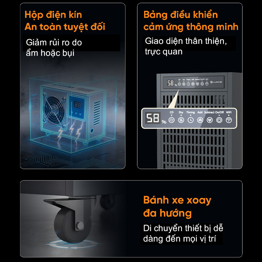 Thiết bị tích hợp bảng điều khiển cảm ứng hiện đại với giao diện trực quan, hiển thị rõ ràng các thông số giúp người dùng thao tác nhanh và kiểm soát hoạt động dễ dàng. Hộp điện kín đóng vai trò như lớp bảo vệ an toàn, hạn chế bụi bẩn và hơi ẩm xâm nhập vào linh kiện bên trong, nâng cao độ bền khi vận hành lâu dài. Ngoài ra, hệ thống bánh xe xoay đa hướng giúp di chuyển máy linh hoạt giữa các khu vực, đáp ứng tốt nhu cầu kiểm soát ẩm trong quy mô lớn.