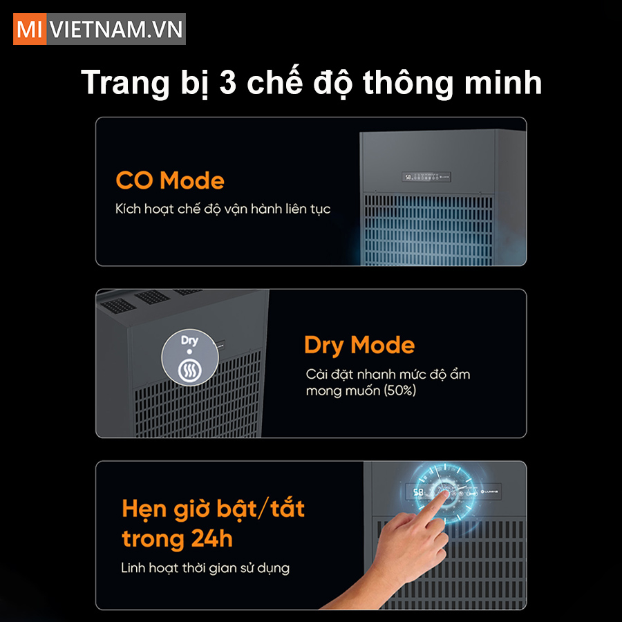 - Hỗ trợ 3 chế độ hoạt động chính: CO, Dry, Hẹn giờ 24h