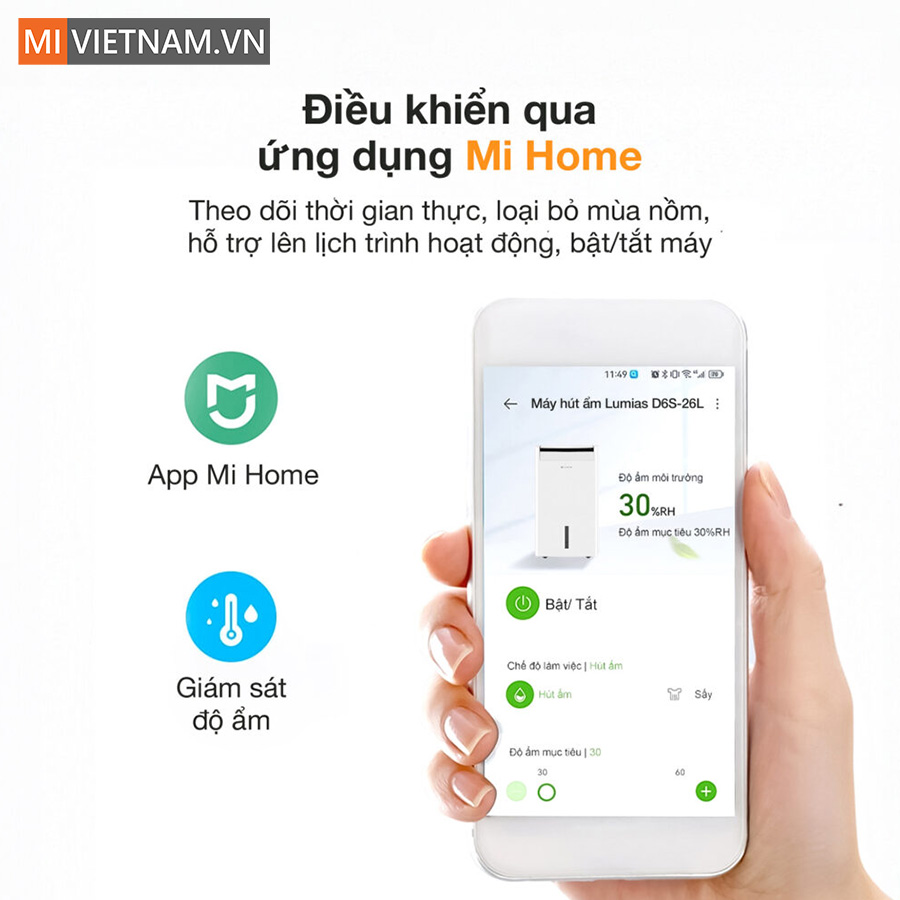 Máy hút ẩm Lumias D6S-26L được trang bị khả năng kết nối và điều khiển từ xa qua ứng dụng Mi Home. Người dùng có thể theo dõi độ ẩm trong phòng theo thời gian thực và điều chỉnh chế độ hoạt động ngay trên điện thoại dù đang không có mặt tại nhà. Ngoài ra, tính năng hẹn giờ linh hoạt trong 12 giờ cho phép người dùng lên lịch bật/tắt tự động, tối ưu hóa hiệu quả hút ẩm và tiết kiệm điện năng.
