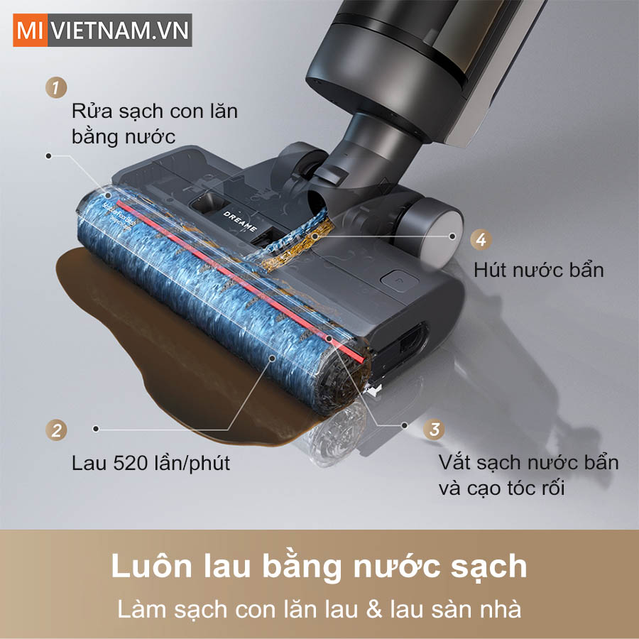 Sức mạnh của máy hút bụi lau nhà cầm tay Dreame G10 Pro còn nằm ở khả năng chà sàn tốc độ cao lên tới 520 vòng/phút, giúp đánh bật mọi vết bẩn cứng đầu, kể cả bùn khô, dầu mỡ hay cặn bám lâu ngày. Hệ thống chổi quay đôi hoạt động đồng bộ vừa chà rửa vừa hút khô, mang lại sàn nhà sạch sâu chỉ sau vài lượt di chuyển.