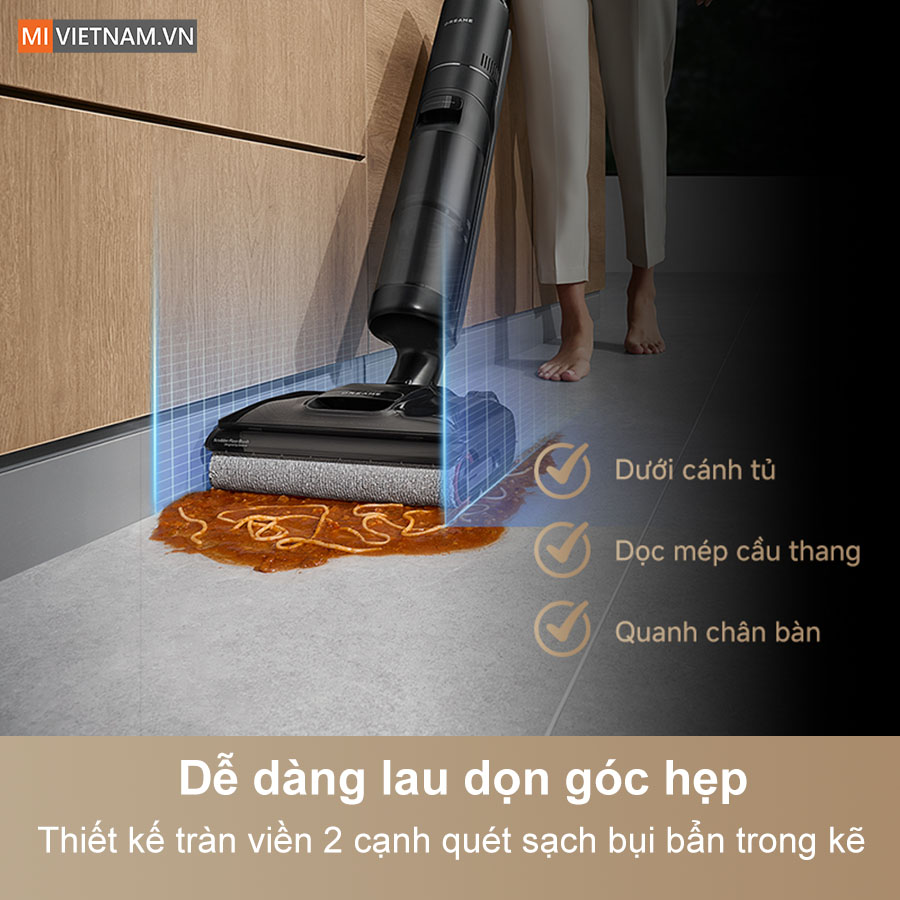 Với công nghệ tràn viền 2 cạnh, máy có khả năng tiếp cận sát mép tường và các góc cạnh khó vệ sinh mà những dòng máy thông thường hay bỏ sót. Nhờ đó, bụi bẩn, tóc rối hay vết bám ở rìa tường đều được xử lý gọn gàng chỉ trong một lần đi qua. Phù hợp với những không gian nhiều ngóc ngách chân tường khe hẹp, nơi thường là “điểm mù của các thiết bị vệ sinh truyền thống.
