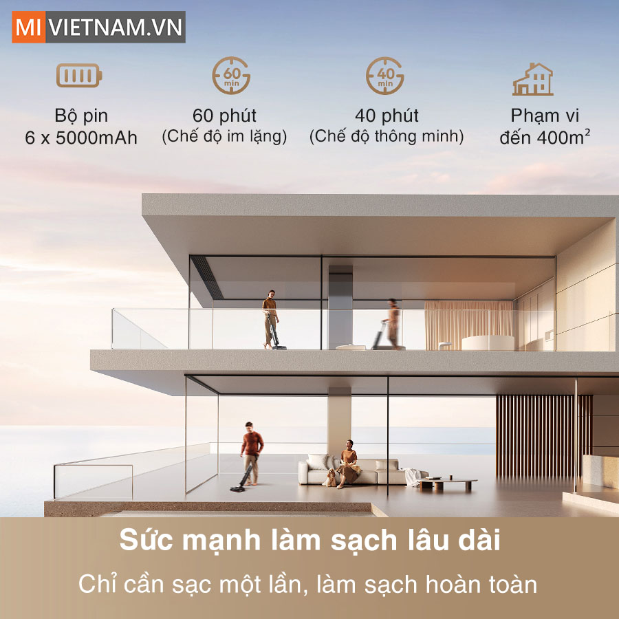 Sở hữu khối pin 6 cell dung lượng 5.000mAh, Dreame H15 Pro FoamWash có thể hoạt động liên tục trong 60 phút ở chế độ yên tĩnh, và khoảng 40 phút ở chế độ tự động. Người dùng có thể dễ dàng dọn dẹp không gian rộng tới 400m² chỉ trong một lần sạc, đảm bảo quá trình làm sạch mượt mà và liền mạch từ đầu đến cuối.