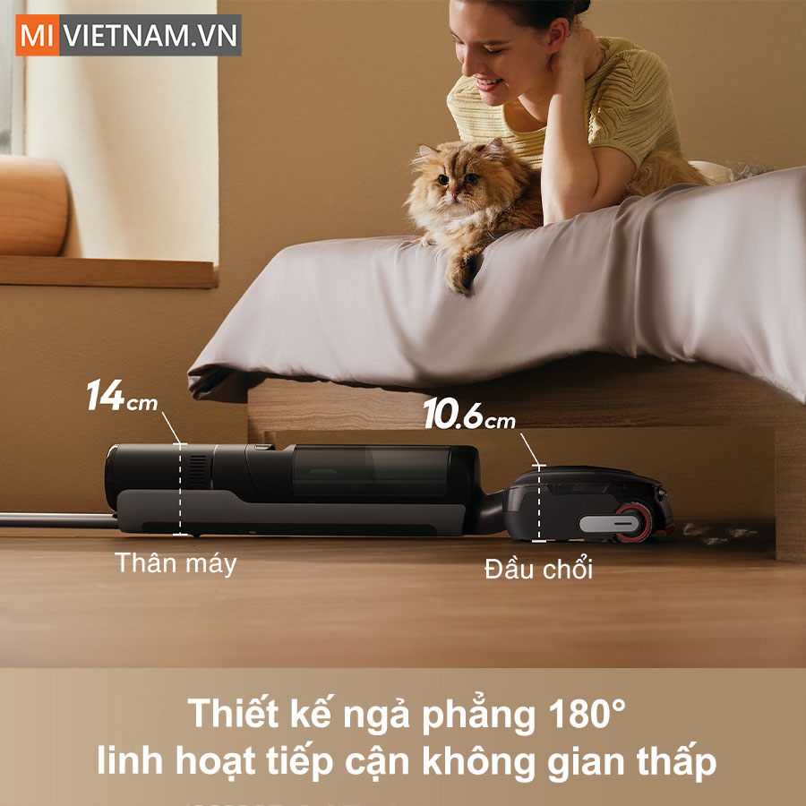 Máy hút bụi lau nhà Dreame H15 Pro FoamWash có khả năng ngả phẳng 180° và ôm sát mặt sàn, dễ dàng tiếp cận không gian thấp chỉ 14cm cho thân máy và 10.6cm cho đầu chổi. Nhờ bình chứa nước bẩn được tách riêng biệt, động cơ luôn được bảo vệ an toàn, giữ lực hút ổn định ngay cả khi vệ sinh dưới gầm giường hay ghế sofa.
