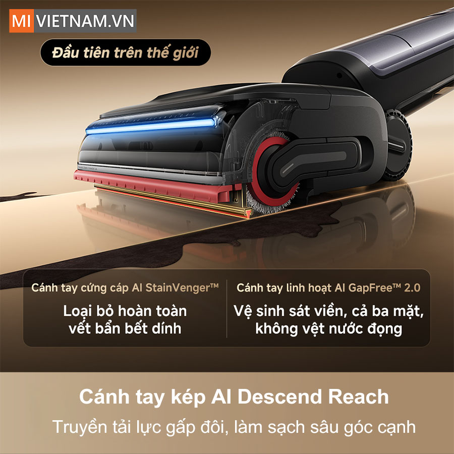 - Cánh tay linh hoạt AI GapFree™ 2.0: Với thiết kế 0 khe hở và 0 vệt nước, cánh tay này tiếp xúc trực tiếp với các cạnh, áp sát vào góc tường và khe hẹp, đảm bảo loại bỏ sạch bụi bẩn. Cảm biến từ tính đa hướng giúp nhận diện hướng di chuyển và tự động thu lại khi quay về, ngăn chặn tình trạng để lại vệt nước trên sàn.