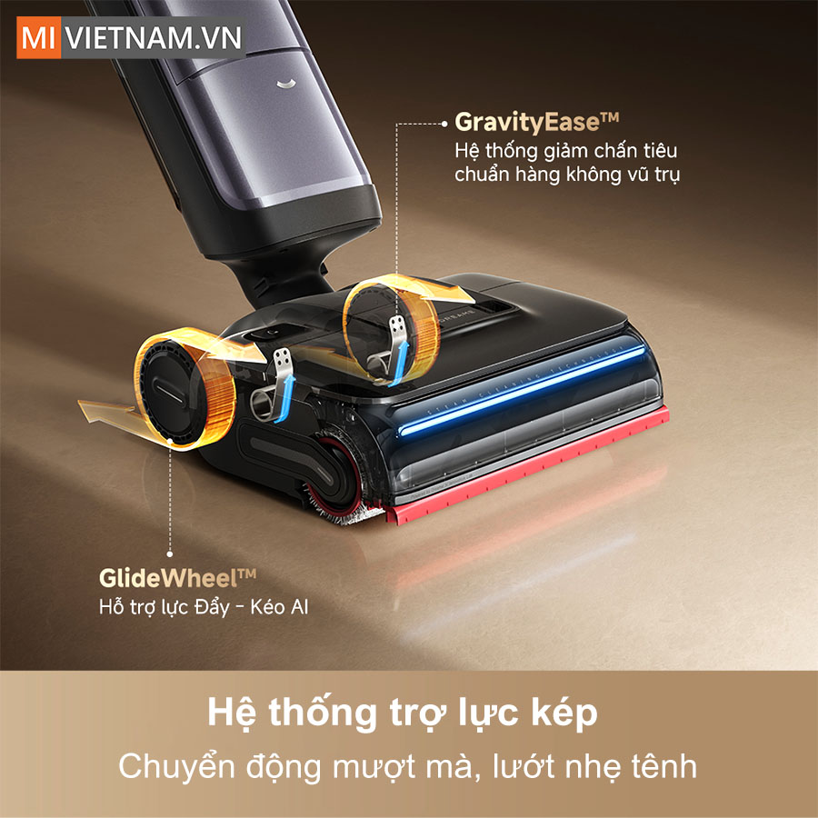 Để tối ưu trải nghiệm sử dụng, Dreame H16 Pro Steam được trang bị hệ thống trợ lực kép GravityEase™ (giảm chấn chuẩn hàng không) và GlideWheel™ (hỗ trợ đẩy/kéo bằng AI). Thiết kế này giúp cân bằng và triệt tiêu một phần trọng lượng của máy, mang lại cảm giác nhẹ tay hơn khi cầm nắm và di chuyển, nhưng vẫn duy trì hiệu quả làm sạch mạnh mẽ mà không để lại nước dư thừa trên sàn.
