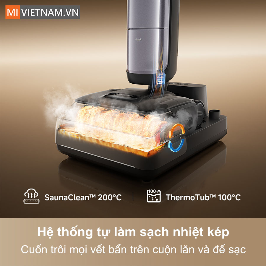 Bàn chải lăn nhiệt độ cao được gia nhiệt 360°, kết hợp cùng công nghệ cấp nước kép Air Pump & Water Pump, mang đến dòng nước áp lực mạnh, phân bổ đều từ 57 vòi phun bao quanh. Nhờ đó, sàn nhà được thấm đều nước nóng, duy trì nhiệt độ ổn định, hạn chế thất thoát nhiệt và đảm bảo hiệu quả làm sạch vượt trội.