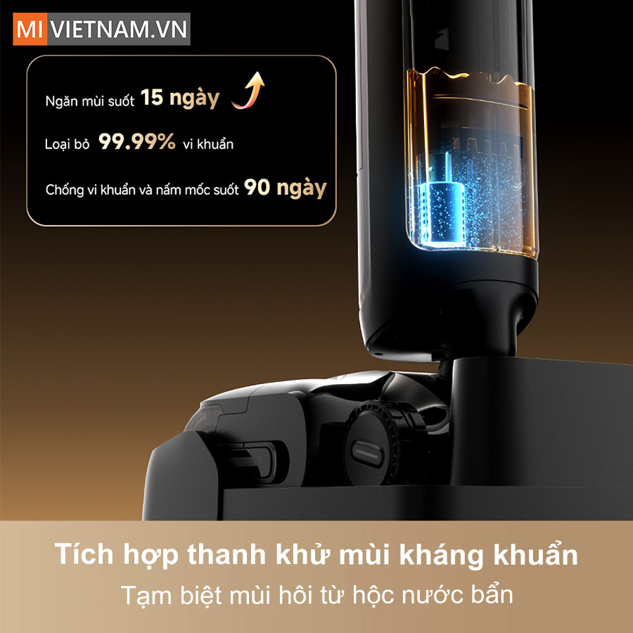 - Xả (Rinse): Các bọt khí siêu vi mô thâm nhập vào từng sợi chổi và các khe khó tiếp cận, rửa trôi bụi bẩn, đồng thời làm sạch cả khe hút và thành trong của máy.