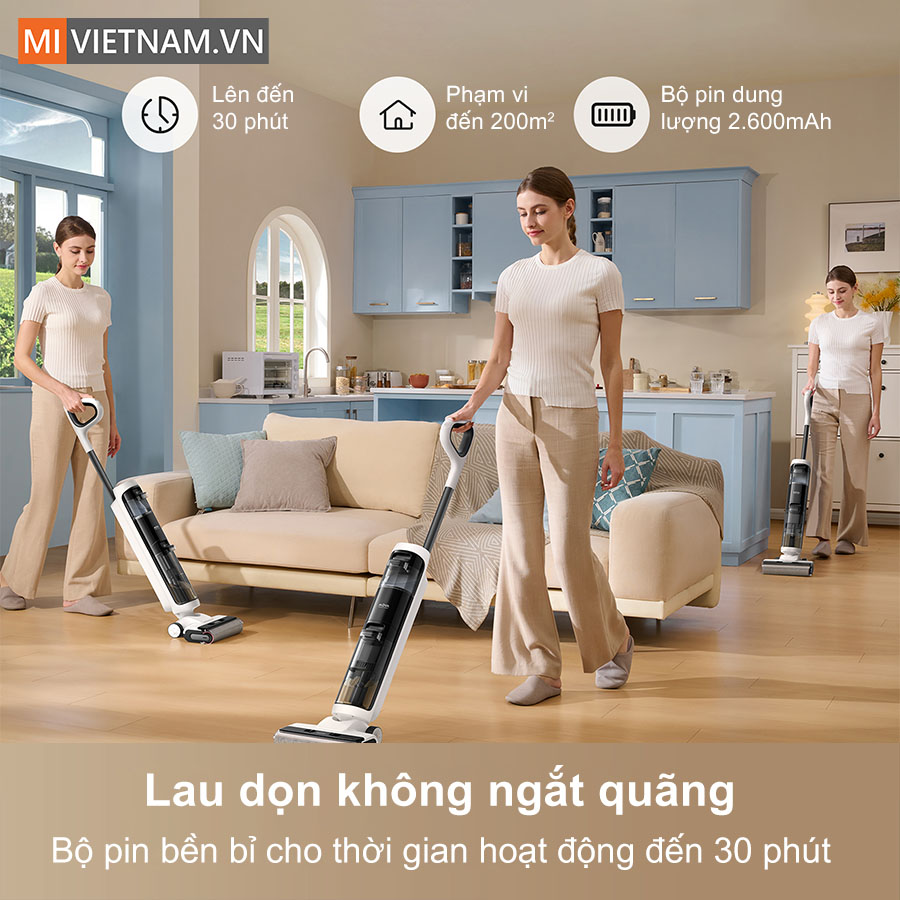• Thời gian hoạt động lên đến 30 phút, phù hợp lau dọn không gian khoảng 200m².
