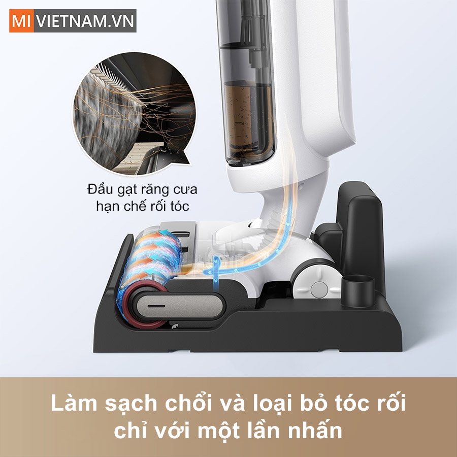 • Tự động vệ sinh chổi lăn với cơ chế xoay đảo chiều và đầu gạt răng cưa, hạn chế rối tóc.