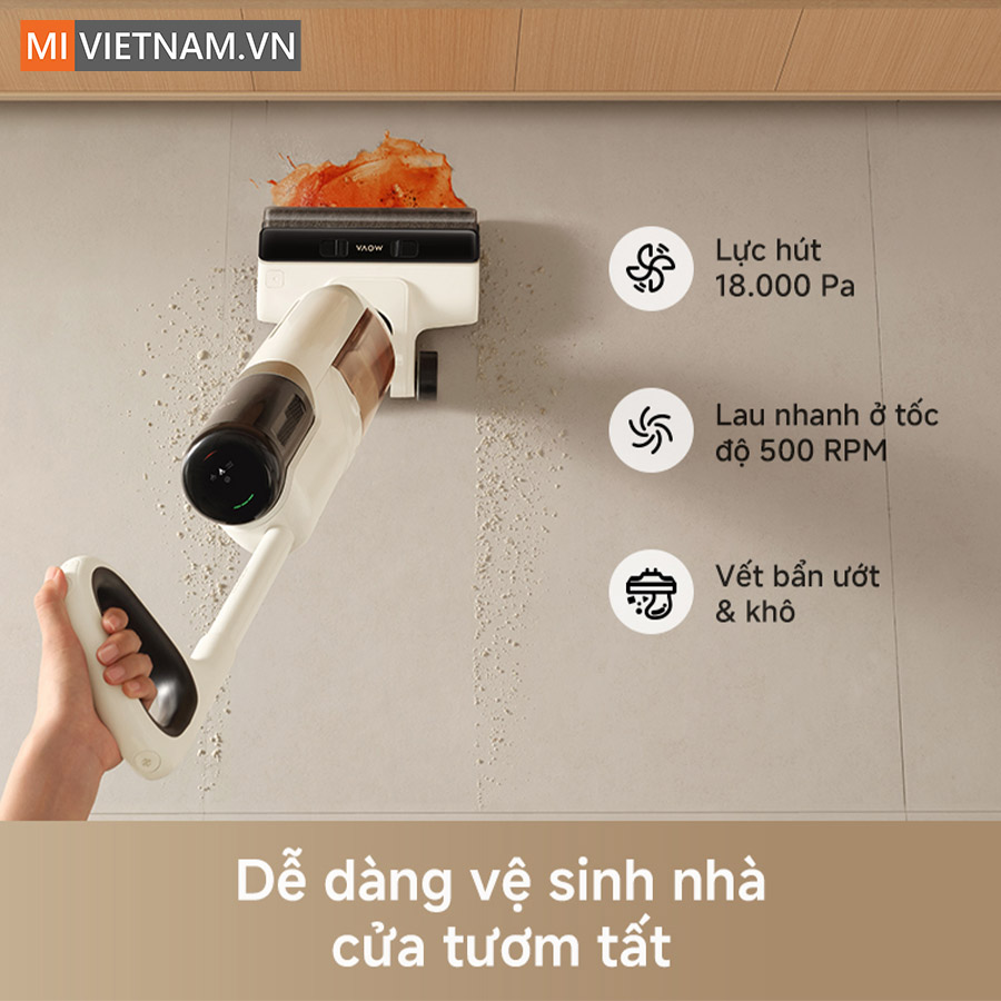 - Lực hút 18.000Pa mạnh mẽ, xử lý hiệu quả vết bẩn khô và ướt