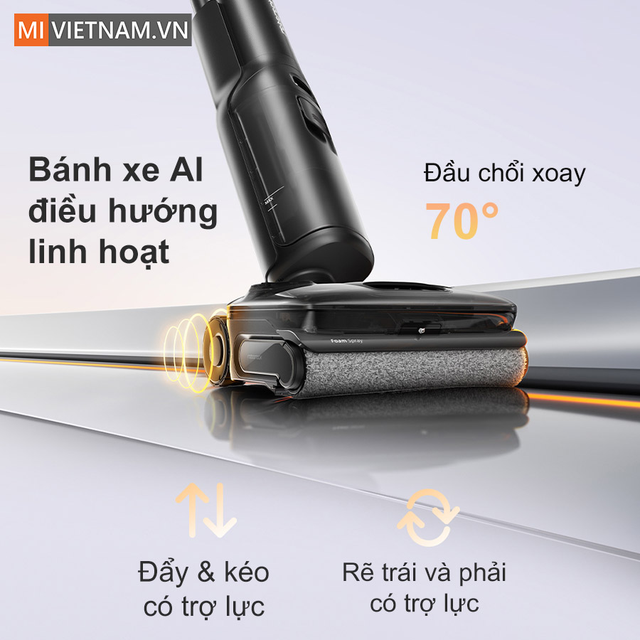 Máy hút bụi lau nhà Roborock F25 ACE Pro được trang bị hệ thống bánh xe điện Electric Wheels, mang đến cảm giác vô cùng nhẹ nhàng, thoải mái khi sử dụng. Nhờ động cơ bánh xe không chổi than, kết hợp thuật toán điều hướng AI tinh chỉnh theo từng chuyển động, thiết bị giúp người dùng đẩy – kéo – xoay chuyển nhẹ nhàng, linh hoạt ở mọi góc độ mà không mất sức.