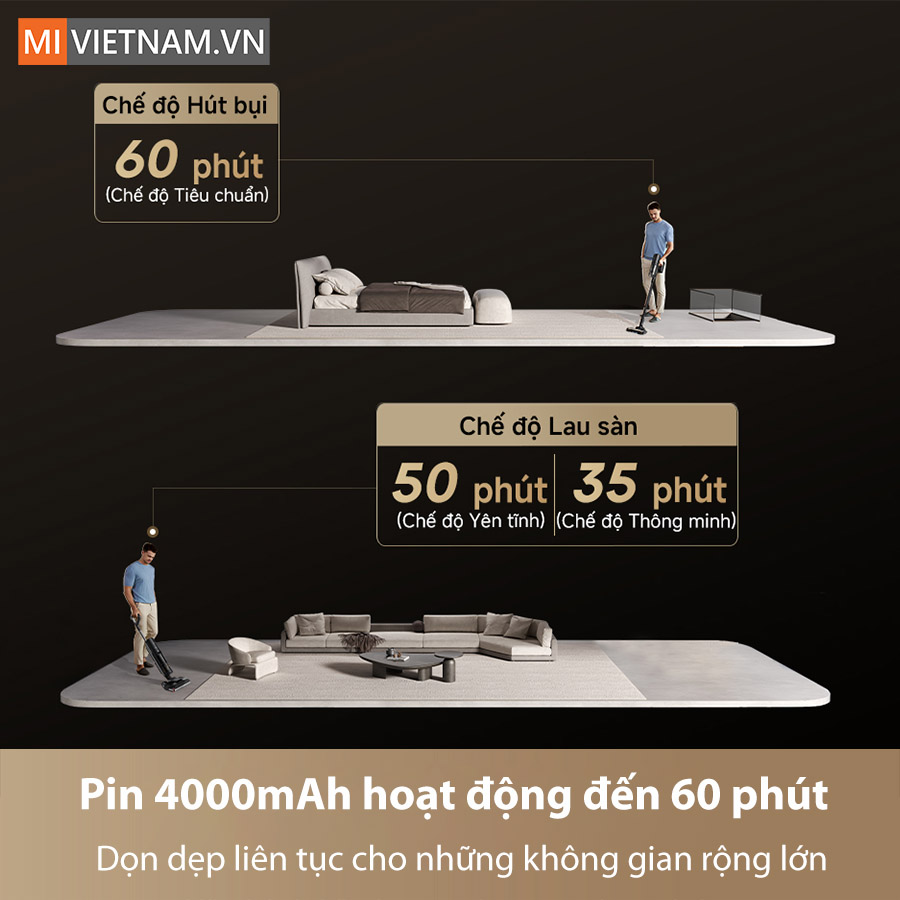| Thời gian hoạt động | Thời gian hút bụi: 60 phút (Tiêu chuẩn) Thời gian lau sàn: 35 – 50 phút tùy chế độ |