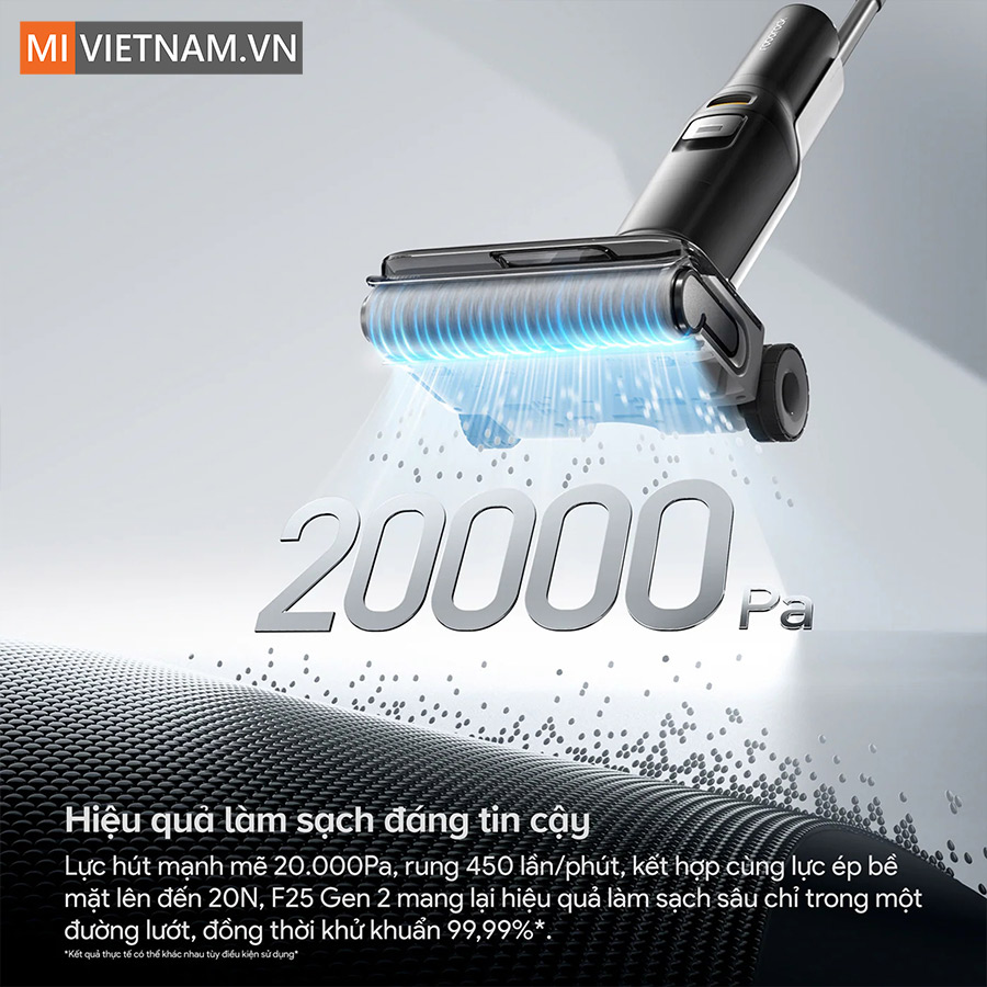 Máy hút bụi lau nhà Roborock F25 Gen 2 được trang bị lực hút mạnh mẽ lên đến 20.000Pa, kết hợp cùng tốc độ xoay con lăn đạt 450 vòng/phút và lực ép xuống sàn 20N, tạo nên khả năng làm sạch toàn diện từ bụi mịn đến vết bẩn cứng đầu. Nhờ cơ chế phối hợp giữa hút và chà sát liên tục, thiết bị có thể loại bỏ tới 99,99% vi khuẩn phổ biến như tụ cầu vàng, nấm men hay E.coli. Tất cả được xử lý gọn gàng chỉ trong một lần di chuyển, tiết kiệm đáng kể thời gian và công sức dọn dẹp.