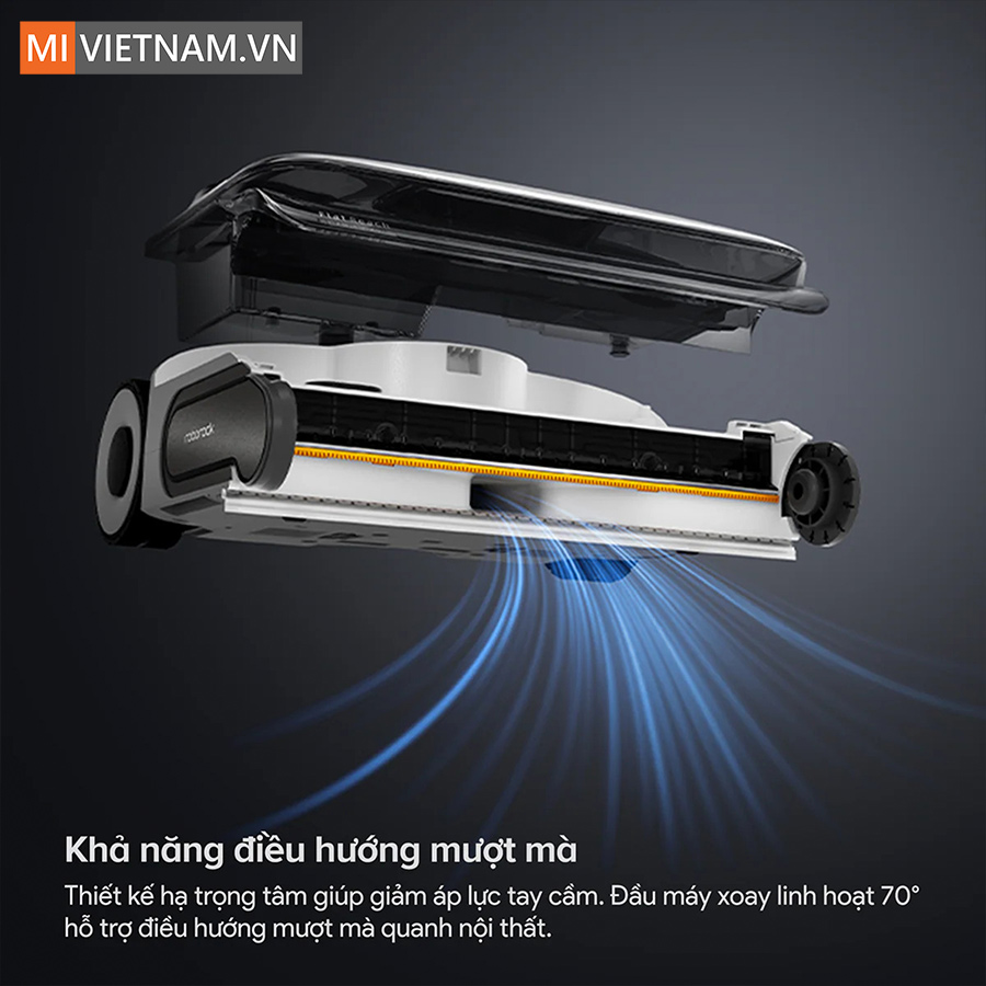 - Bánh xe trợ lực & Đầu cọ xoay 70°: Thao tác đẩy lướt nhẹ tênh, điều hướng linh hoạt quanh đồ đạc.