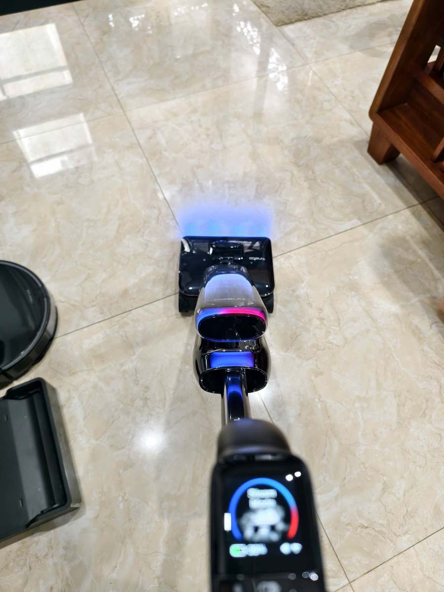 Điểm nhấn tinh tế nằm ở màn hình LCD màu sống động được đặt ngay trên tay cầm, hiển thị rõ ràng mọi thông số vận hành. Bên cạnh đó, hệ thống cảm biến ánh sáng thông minh sử dụng thuật toán AI giúp nhận diện vết bẩn và tự động đổi màu theo tình trạng sàn, hỗ trợ người dùng làm sạch chính xác và nhanh chóng.