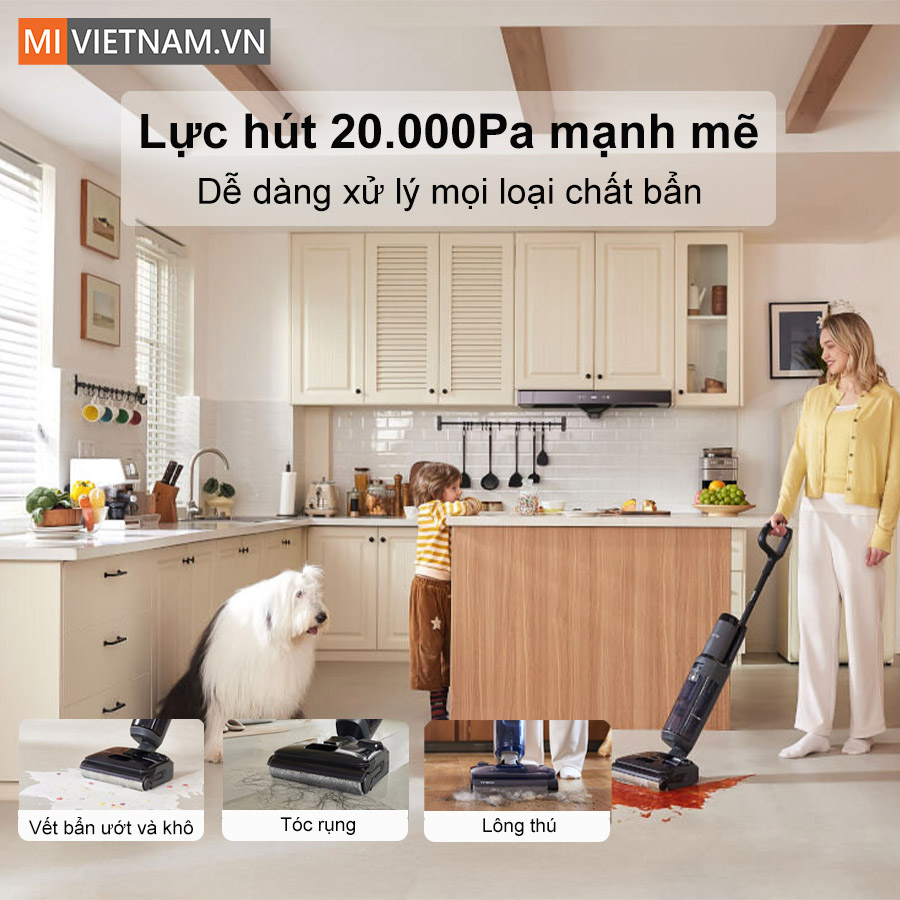 - Lực hút 20.000Pa mạnh mẽ, làm sạch từ bụi mịn đến chất lỏng và lông thú