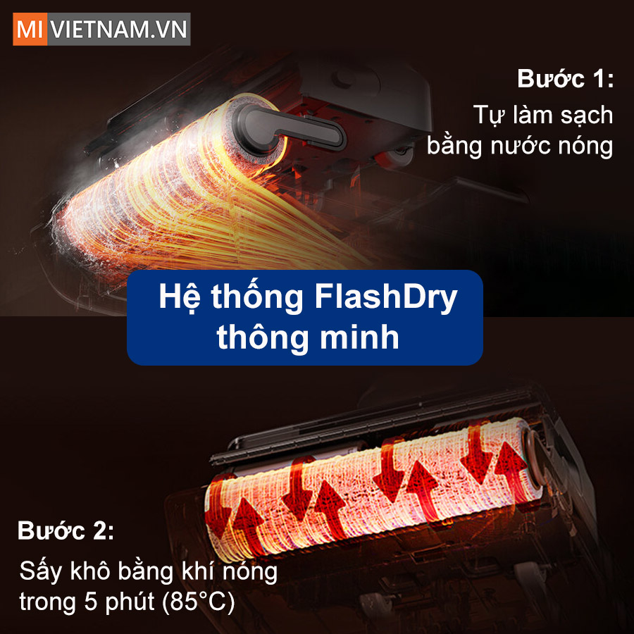 FlashDry là một hệ thống tự làm sạch thông minh được tích hợp trong máy hút bụi lau sàn khô ướt Tineco FLOOR ONE S6 Stretch Extreme, bao gồm rửa bằng nước nóng 85°C và sấy khô bằng khí nóng trong 5 phút. Sau mỗi lần sử dụng, người dùng chỉ cần kích hoạt chế độ này, máy sẽ tự động rửa sạch chổi, ống hút và khoang chứa. Thiết kế kín giúp không khí nóng luân chuyển hiệu quả, ngăn ngừa ẩm mốc và mùi khó chịu phát sinh.