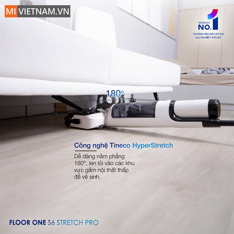 Máy hút bụi lau nhà Tineco Floor One Stretch S6 Pro sở hữu thiết kế siêu mỏng chỉ 13cm, cho phép dễ dàng len lỏi vào những khu vực gầm thấp như gầm giường, ghế sofa hay tủ kệ. Nhờ khả năng gập phẳng 180°, máy có thể linh hoạt tiếp cận những nơi khó làm sạch mà các dòng máy khác không thể chạm tới. Điều này giúp bạn loại bỏ triệt để bụi bẩn, vi khuẩn tích tụ, mang lại không gian sống sạch sẽ và trong lành hơn.