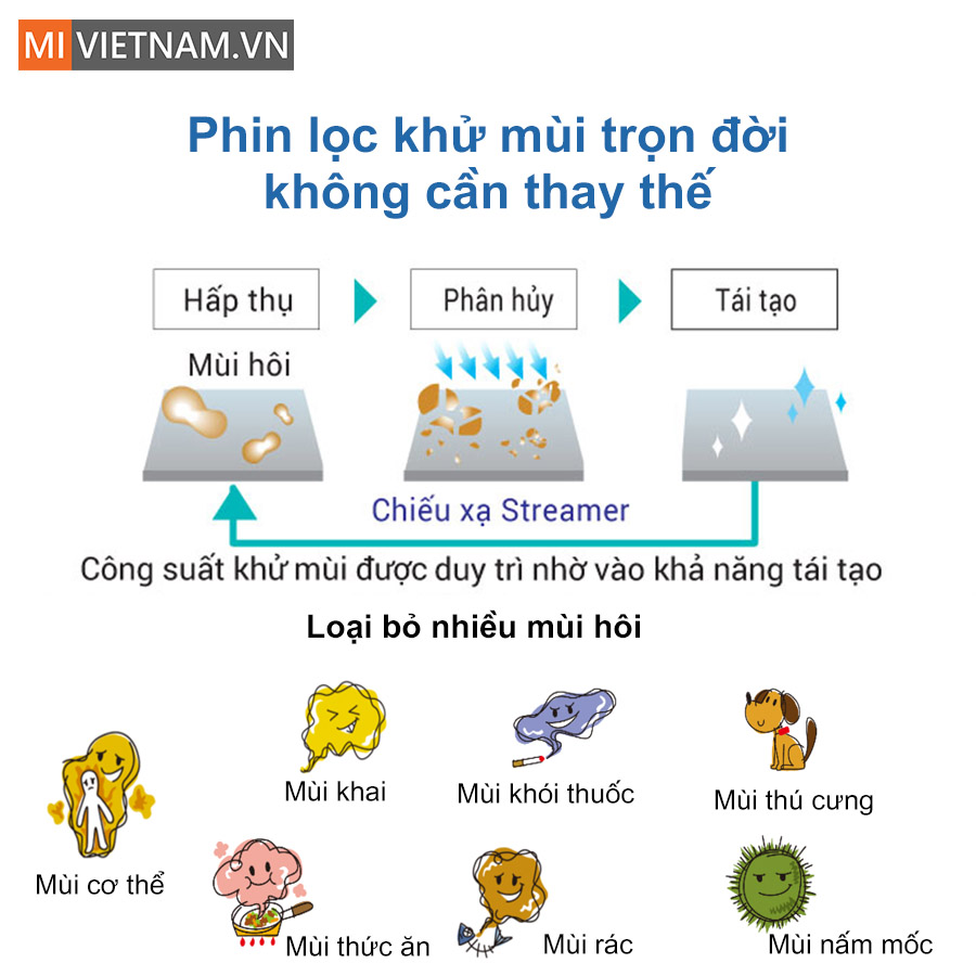 - Tuần hoàn: Sau khi các tác nhân gây mùi bị phân hủy, phin lọc khử mùi được tái tạo khả năng hấp thụ, nhờ vậy người dùng không cần thay thế phin lọc khử mùi trong suốt quá trình sử dụng.