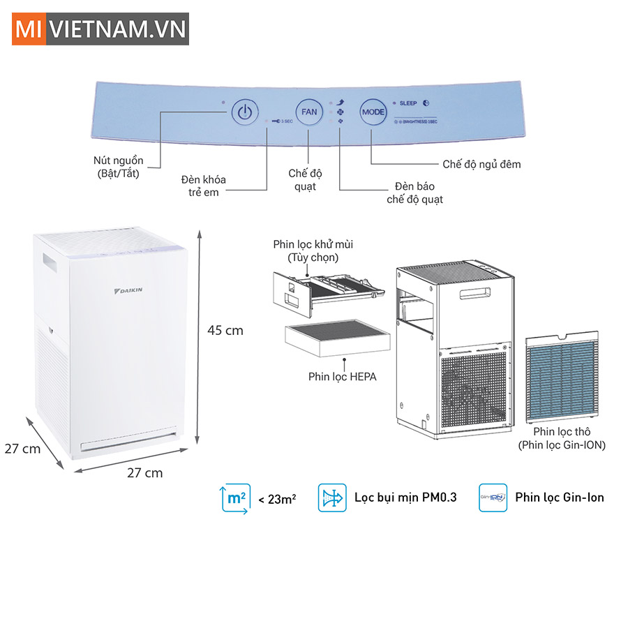 Máy lọc không khí Daikin MCQ30ZVM7 là lựa chọn lý tưởng cho những gia đình hiện đại đang tìm kiếm một thiết bị nhỏ gọn nhưng sở hữu khả năng làm sạch mạnh mẽ. Kế thừa công nghệ tiên tiến từ Nhật Bản, sản phẩm nổi bật với hệ thống lọc 2 cấp gồm màng lọc thô Gin-ION và màng lọc HEPA tĩnh điện, giúp loại bỏ bụi mịn, vi khuẩn và các tác nhân gây hại trong không khí. Với thiết kế tinh tế cùng hiệu quả lọc vượt trội, Daikin MCQ30ZVM7 mang đến không gian sống trong lành, an toàn và tràn đầy năng lượng cho cả gia đình.