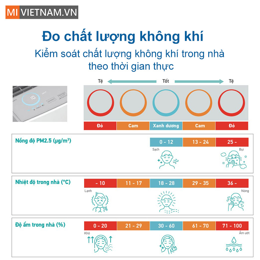 - Đỏ: không khí ô nhiễm, độ ẩm hoặc mùi vượt ngưỡng cho phép.