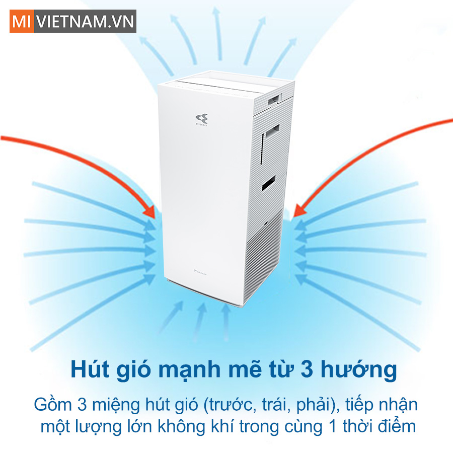 Máy lọc không khí tạo ẩm Daikin MCK70ZVM7 82W được thiết kế với ba miệng hút gió ở mặt trước, bên trái và bên phải, cho phép tiếp nhận cùng lúc lượng lớn không khí. Điều này giúp máy nhanh chóng lọc sạch bụi bẩn và vi khuẩn, mang lại hiệu suất vượt trội.