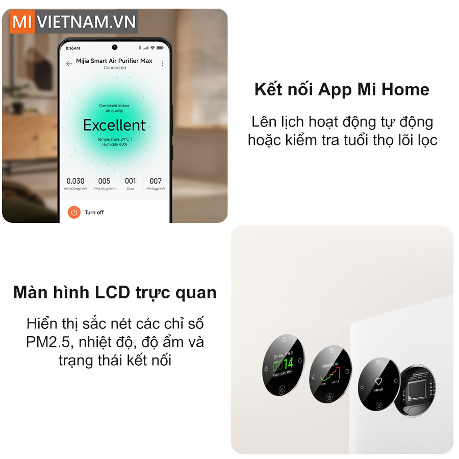 - Màn hình LCD: Được tích hợp ngay trên thân máy, hiển thị sắc nét các chỉ số PM2.5, nhiệt độ, độ ẩm và trạng thái kết nối. Mọi thao tác điều chỉnh chế độ chỉ gói gọn trong những cú chạm nhẹ nhàng.