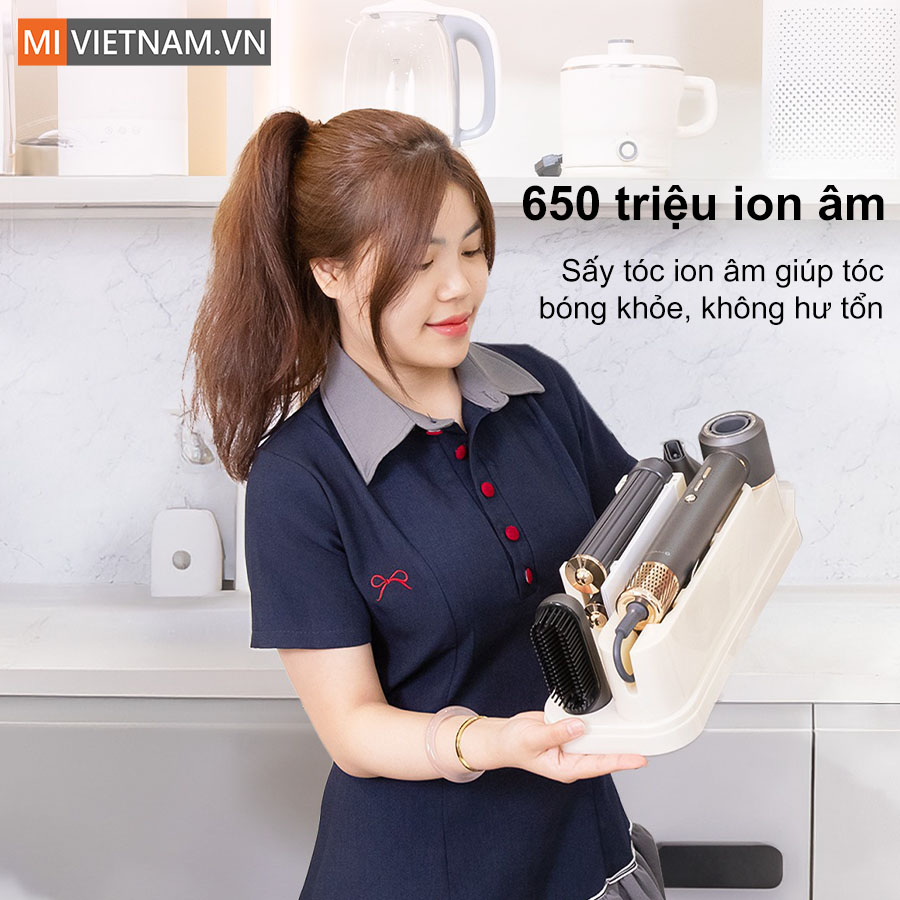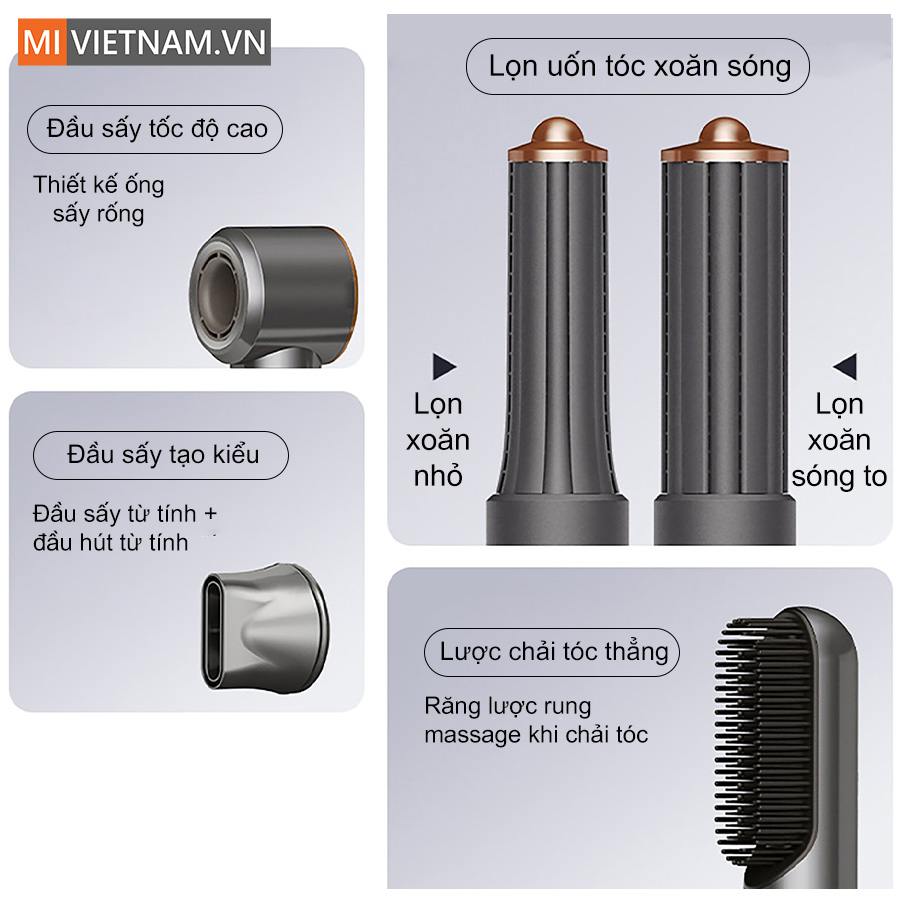 • 5 đầu sấy đa năng tạo kiểu suôn thẳng, uốn xoăn, tạo phồng