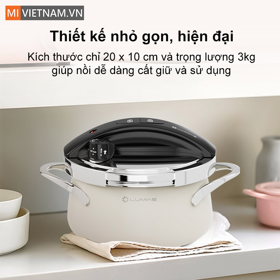Nồi áp suất Lumias LPC-068 có kiểu dáng tinh tế, phù hợp với nhiều không gian bếp. Với kích thước nhỏ gọn chỉ 20 x 10 cm và trọng lượng 3kg, nồi dễ dàng di chuyển và cất giữ, không chiếm nhiều diện tích.