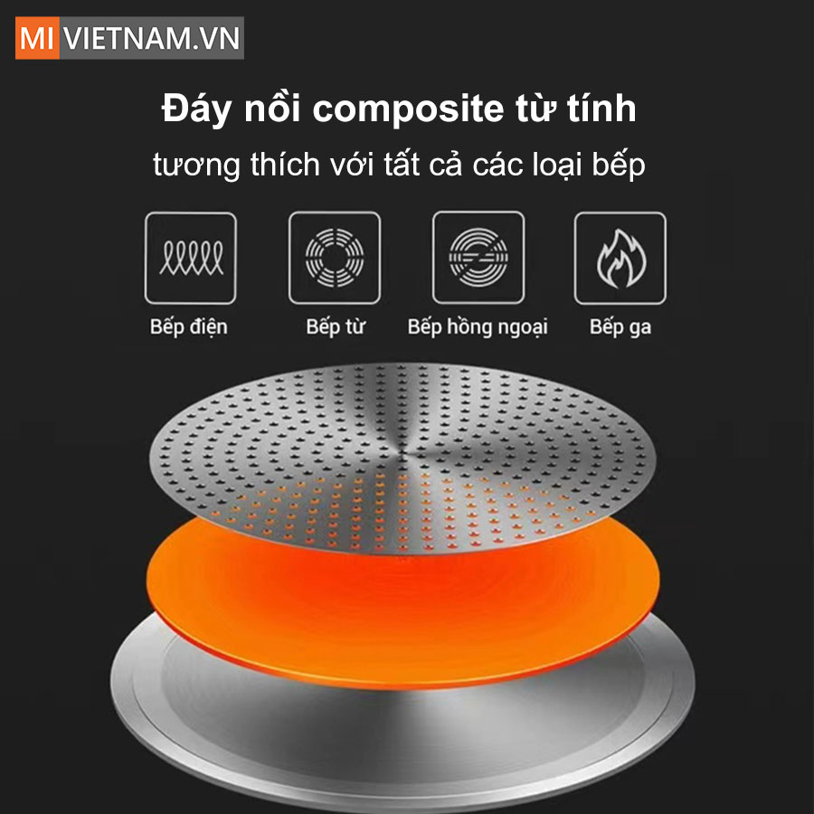 | Khả năng tương thích | Đáy nồi Composite từ tính phù hợp với mọi loại bếp |