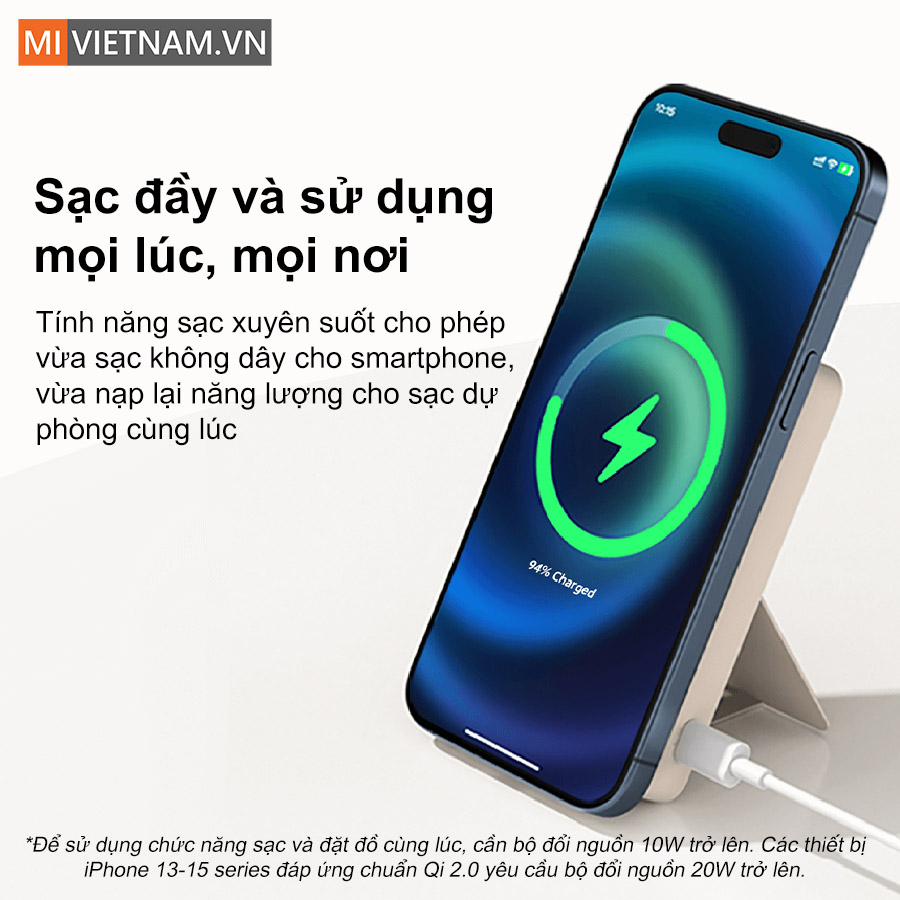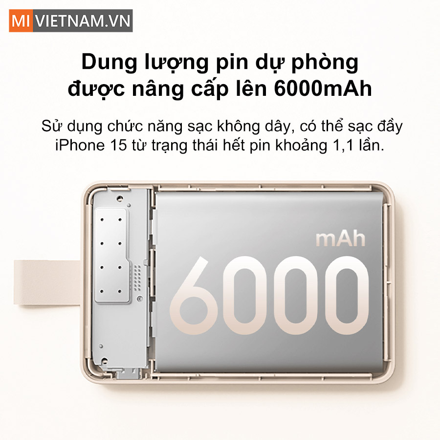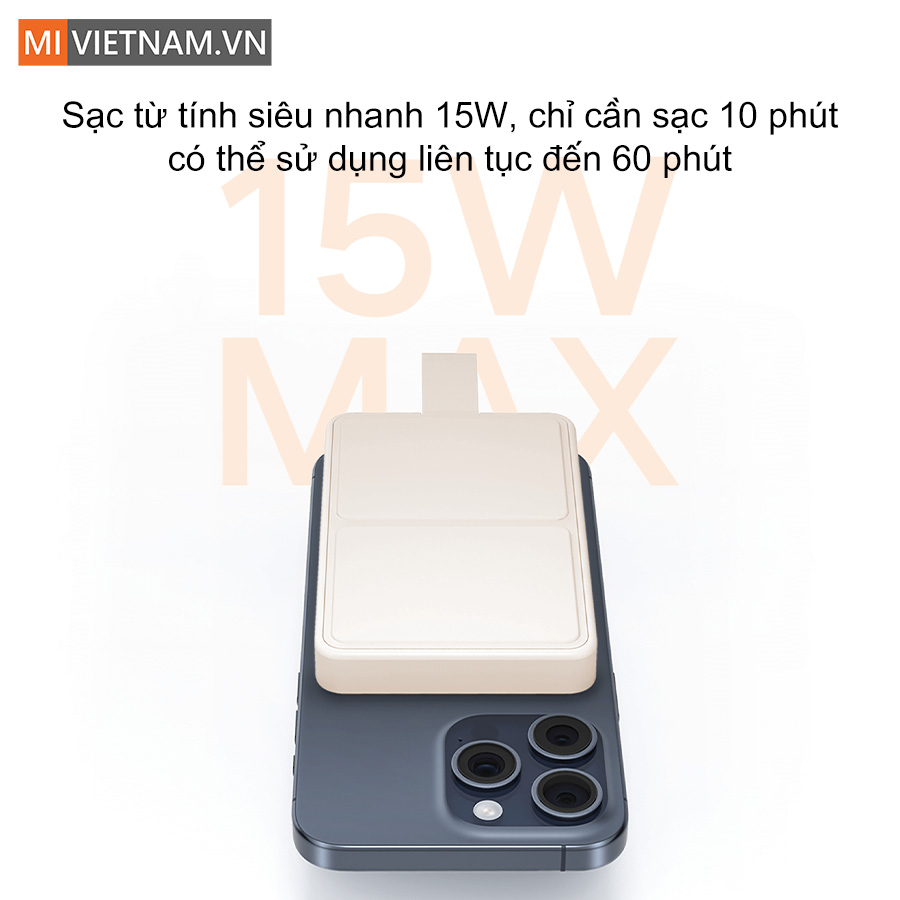 Pin sạc dự phòng Xiaomi Magnetic Power Bank 6000mAh là phụ kiện sạc không dây cao cấp dành cho iPhone và các thiết bị hỗ trợ chuẩn Qi 2.0, mang đến trải nghiệm sạc nhanh, an toàn và cực kỳ tiện lợi. Sở hữu thiết kế từ tính thông minh, lực hút mạnh, chân đế ẩn tiện dụng cùng khả năng sạc không dây 15W, sản phẩm là lựa chọn lý tưởng cho người dùng thường xuyên di chuyển, làm việc hay giải trí trên smartphone.