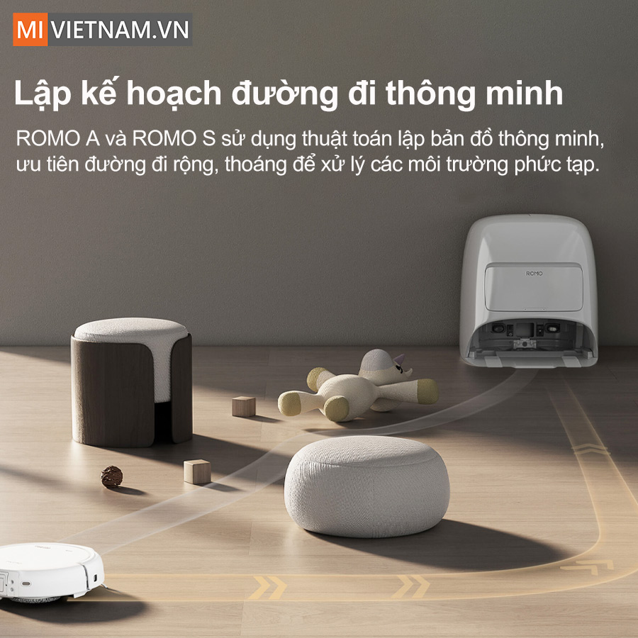 DJI ROMO A được thiết kế với khả năng thích ứng thông minh theo từng loại không gian. Ở những khu vực rộng rãi, robot ưu tiên di chuyển theo lối đi lớn để tối ưu thời gian làm sạch. Khi tiếp cận các khu vực nhiều chướng ngại vật như chân bàn, dây điện hay góc tường, thiết bị sẽ tự động giảm tốc và tiếp cận cẩn thận để làm sạch kỹ lưỡng hơn.