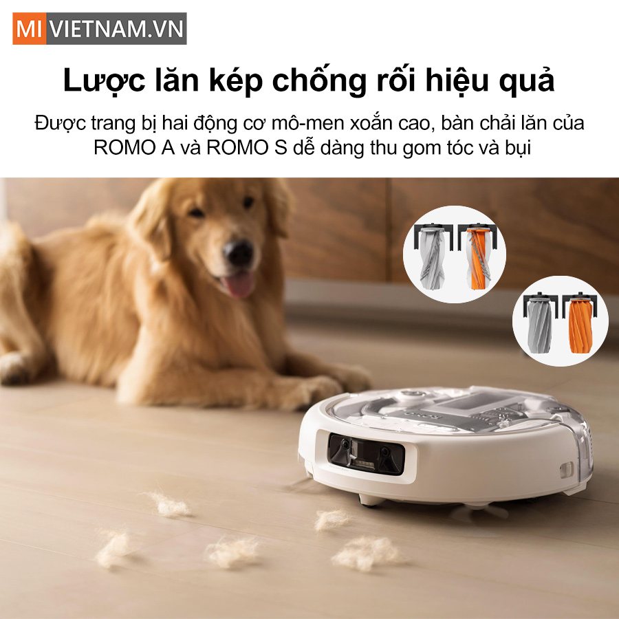 Robot hút bụi DJI ROMO A được trang bị hệ thống bàn chải lăn kép chống rối, giải quyết triệt để tình trạng tóc và lông thú quấn vào chổi, một vấn đề phổ biến trên nhiều robot hút bụi.