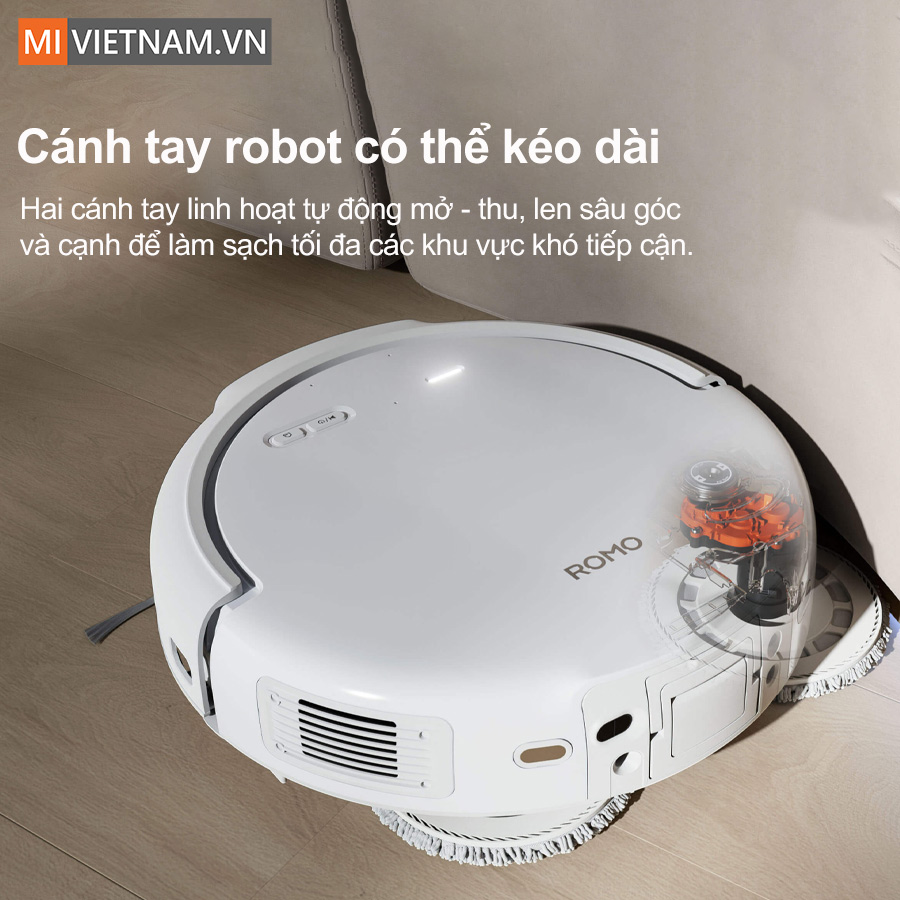 Khi di chuyển dọc theo mép tường hoặc vật cản, hai cánh tay sẽ tự động vươn ra để quét sạch bụi bẩn từ các khe hẹp ra ngoài. Sau khi hoàn tất, chúng sẽ thu gọn lại để đảm bảo robot tiếp tục di chuyển mượt mà trong không gian hẹp.