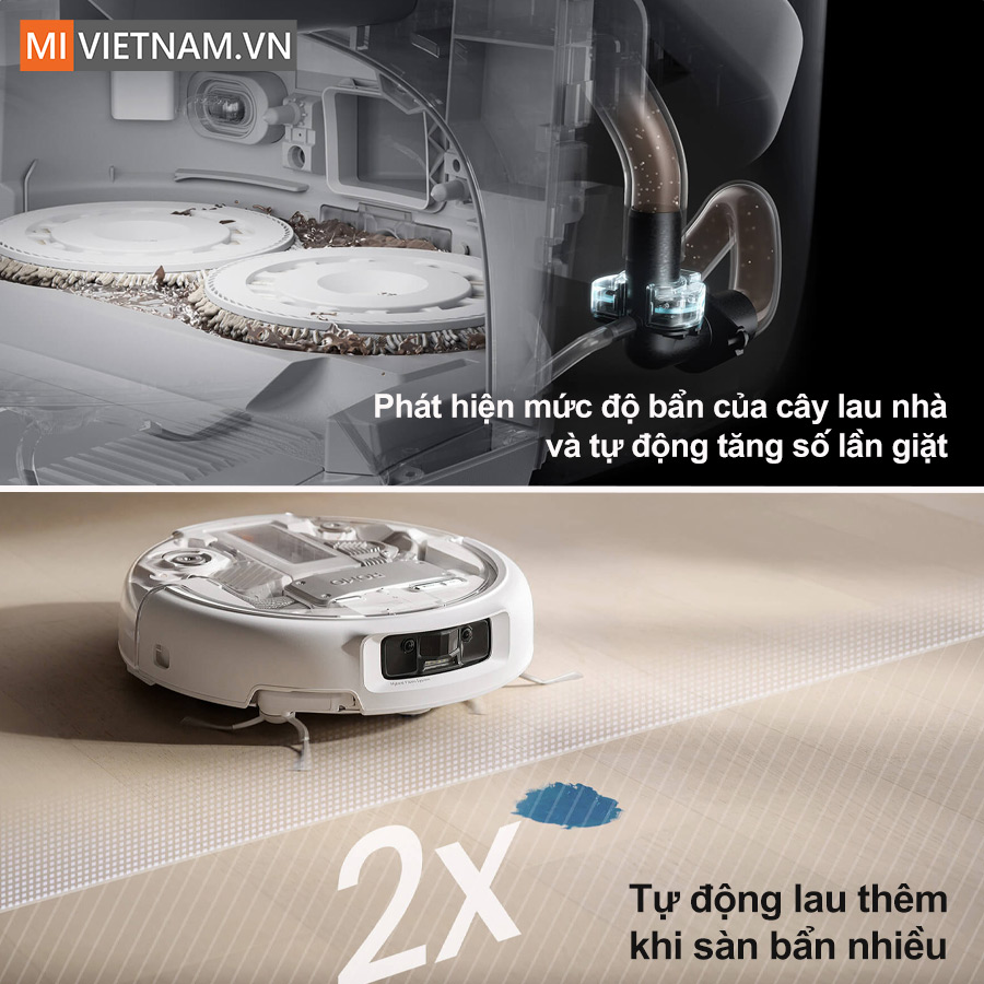 Đối với các vết bẩn cứng đầu, robot sẽ tự động tăng lượng nước để làm mềm và loại bỏ hiệu quả. Nhờ đó, sàn nhà luôn được làm sạch đồng đều, không xảy ra tình trạng khô hoặc loang nước.