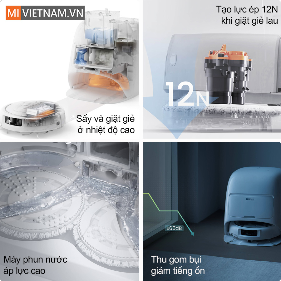 - Trạm sạc đa năng tự làm sạch: Giặt khăn bằng tia nước áp suất cao và sấy khô bằng khí nóng, đảm bảo vệ sinh khép kín.