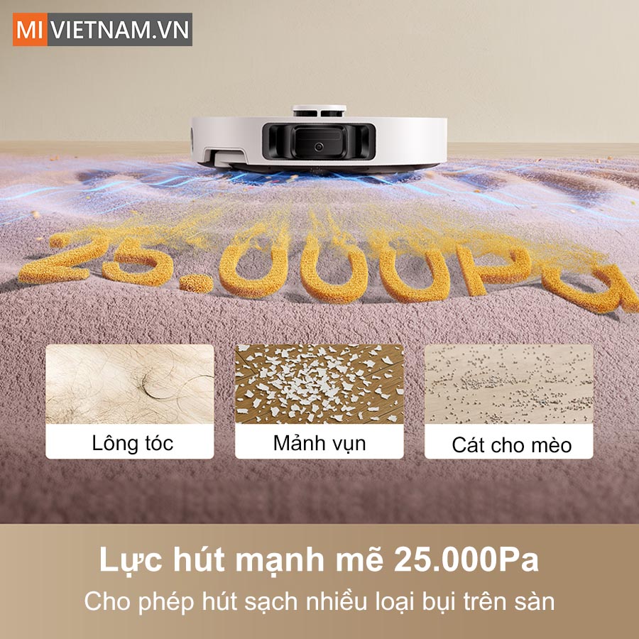 Lực hút mạnh mẽ 25.000Pa hút sạch bụi bẩn trong một lần di chuyển