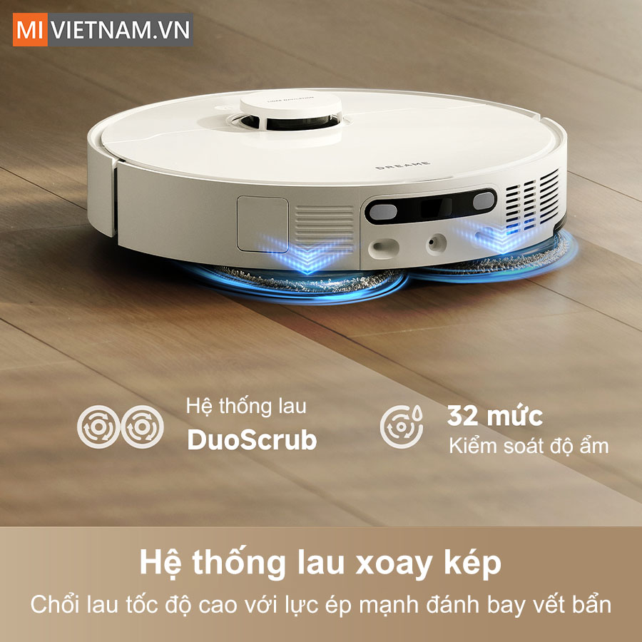 Robot hút bụi lau nhà Dreame L10s Ultra Gen 3 được trang bị hệ thống lau DuoScrub gồm hai đĩa lau quay tốc độ cao, giúp đánh bay mọi vết bẩn cứng đầu và mang lại sàn khô nhanh, thân thiện với thú cưng. Đặc biệt, công nghệ điều chỉnh độ ẩm 32 cấp độ cho phép robot kiểm soát chính xác lượng nước, từ khô nhẹ, ẩm vừa đến ướt kỹ, phù hợp với từng loại sàn khác nhau. Nhờ đó, sàn gỗ không bị thấm nước, gạch men được làm sạch sâu, còn thảm luôn khô ráo như mới.