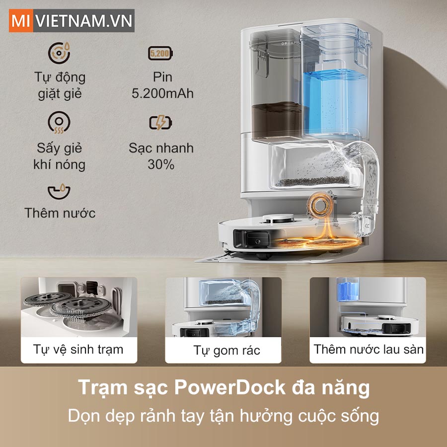- Tự châm nước sạch, xả nước bẩn và pha dung dịch lau sàn tự động, đảm bảo mỗi lần robot khởi động đều trong tình trạng sẵn sàng hoàn hảo.