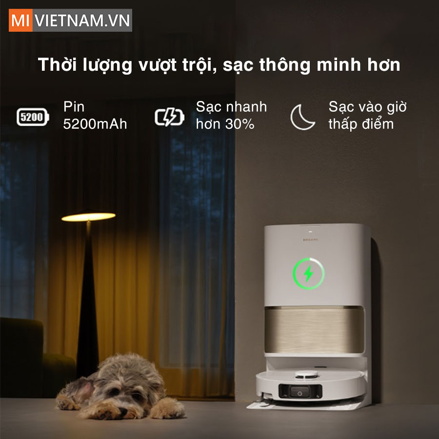 Sở hữu viên pin dung lượng lớn 5.200mAh, robot hút bụi lau nhà Dreame L50 Ultra CE có thể hoạt động liên tục tới 231 phút, bao phủ diện tích lên đến 156m² chỉ trong một lần sạc, đặc biệt ở chế độ hút yên tĩnh. Không chỉ mạnh mẽ mà còn tiết kiệm điện, robot hỗ trợ sạc nhanh hơn 30% và tự động sạc vào khung giờ thấp điểm, giúp giảm chi phí năng lượng mà vẫn duy trì hiệu suất tối đa cho mỗi lần vận hành.
