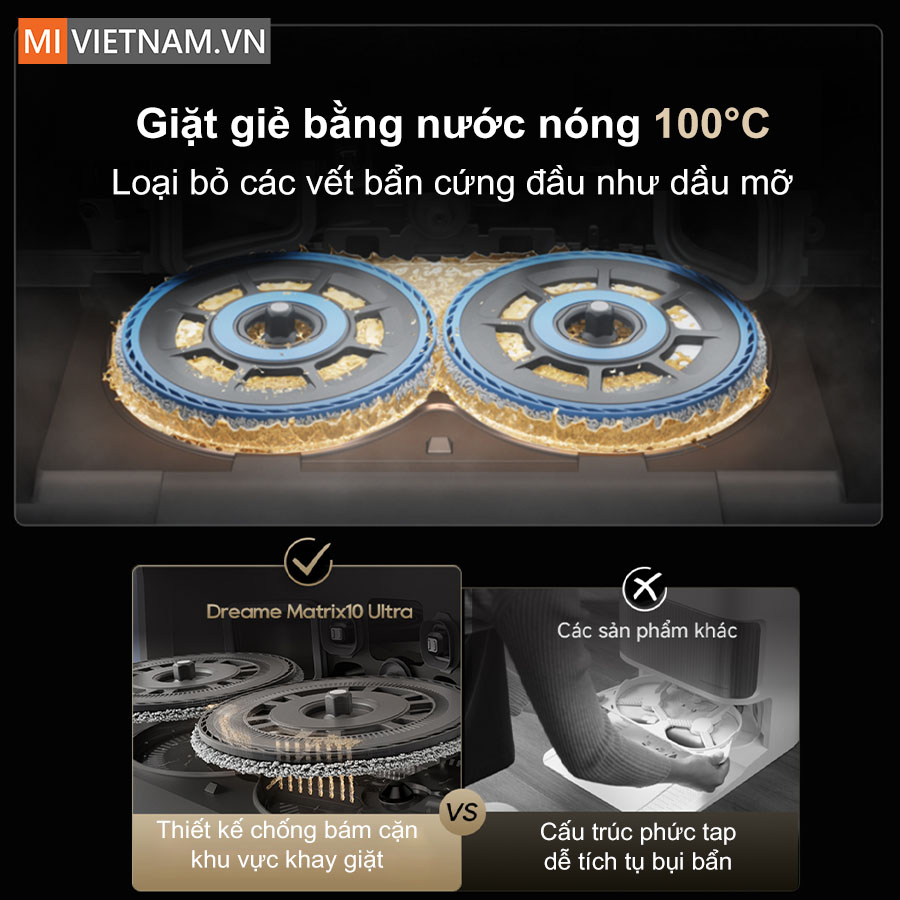 Robot hút bụi lau nhà Dreame Matrix10 Ultra sở hữu công nghệ ThermoHub™, sử dụng hệ thống PTC tích hợp vào bề mặt bàn chà, có thể làm nóng nước đến 100°C để giặt giẻ. Nhờ vậy, những vết bẩn cứng đầu như dầu mỡ trong bếp được loại bỏ dễ dàng, đồng thời tiêu diệt vi khuẩn hiệu quả.