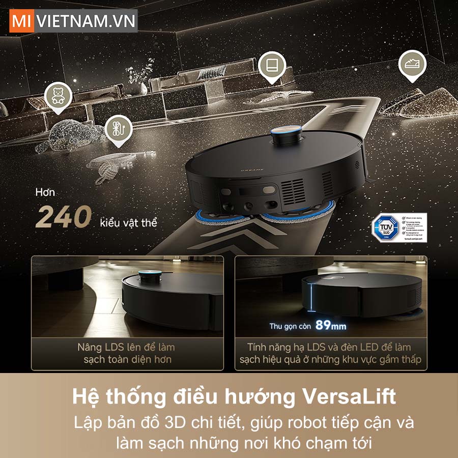Với công nghệ VersaLift Navigation, Dreame Matrix10 Ultra dễ dàng di chuyển dưới các khu vực mà robot truyền thống thường bỏ sót, như gầm giường hoặc sofa thấp.