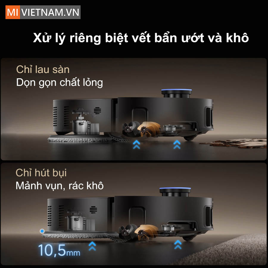 - Chỉ hút bụi: Làm sạch mảnh vụn, tóc, bụi và rác khô với khoảng nâng 10,5mm giúp tránh làm ướt bề mặt.