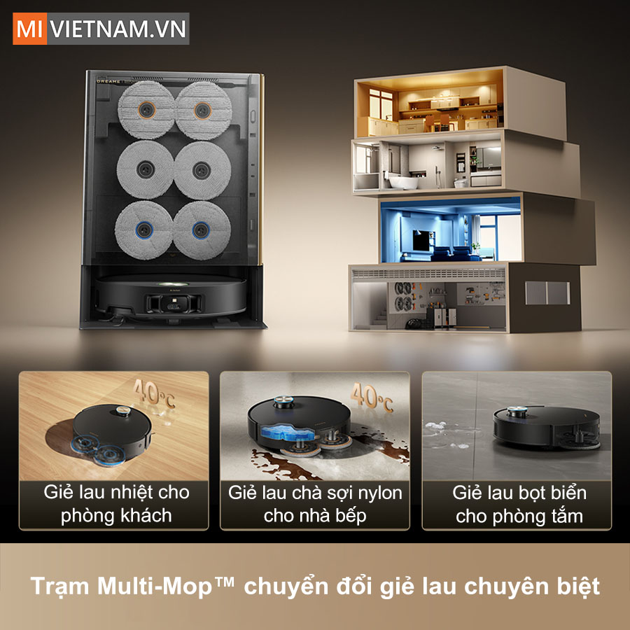 - Công nghệ Multi-Mop™ Dock tự động thay đổi giẻ lau thông minh