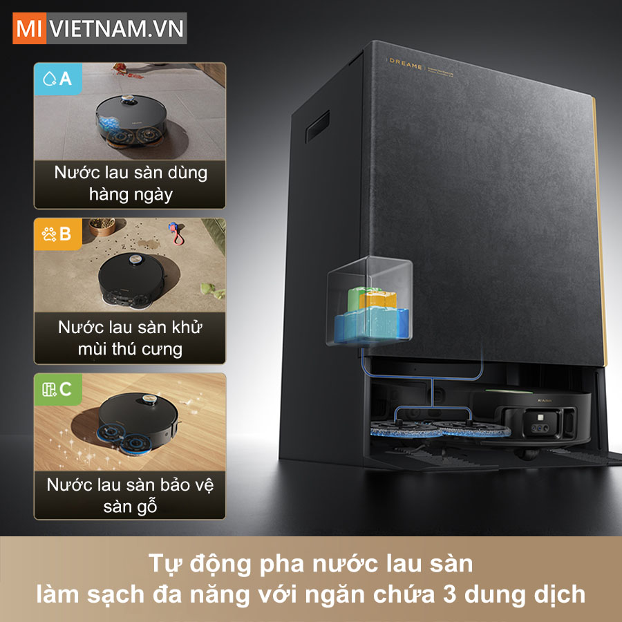 Dreame Matrix10 Ultra tích hợp hệ thống 3 ngăn dung dịch thông minh, cho phép người dùng lựa chọn giải pháp làm sạch phù hợp từng tình huống thay vì chỉ dùng một loại dung dịch duy nhất.