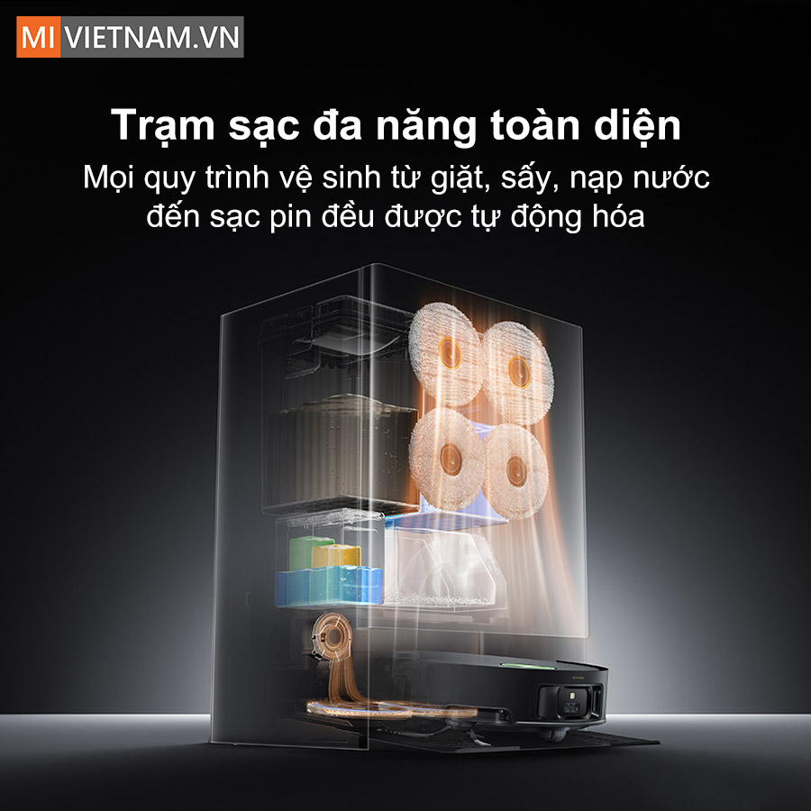 Chỉ cần đặt robot vào trạm, mọi quy trình vệ sinh từ giặt, sấy, nạp nước đến sạc pin đều được tự động hóa hoàn toàn.