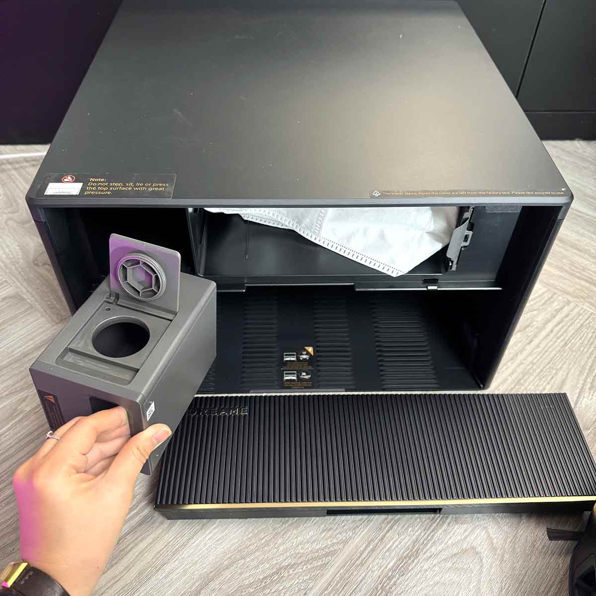 Tự động hút bụi vào hộp rác trong trạm sạc