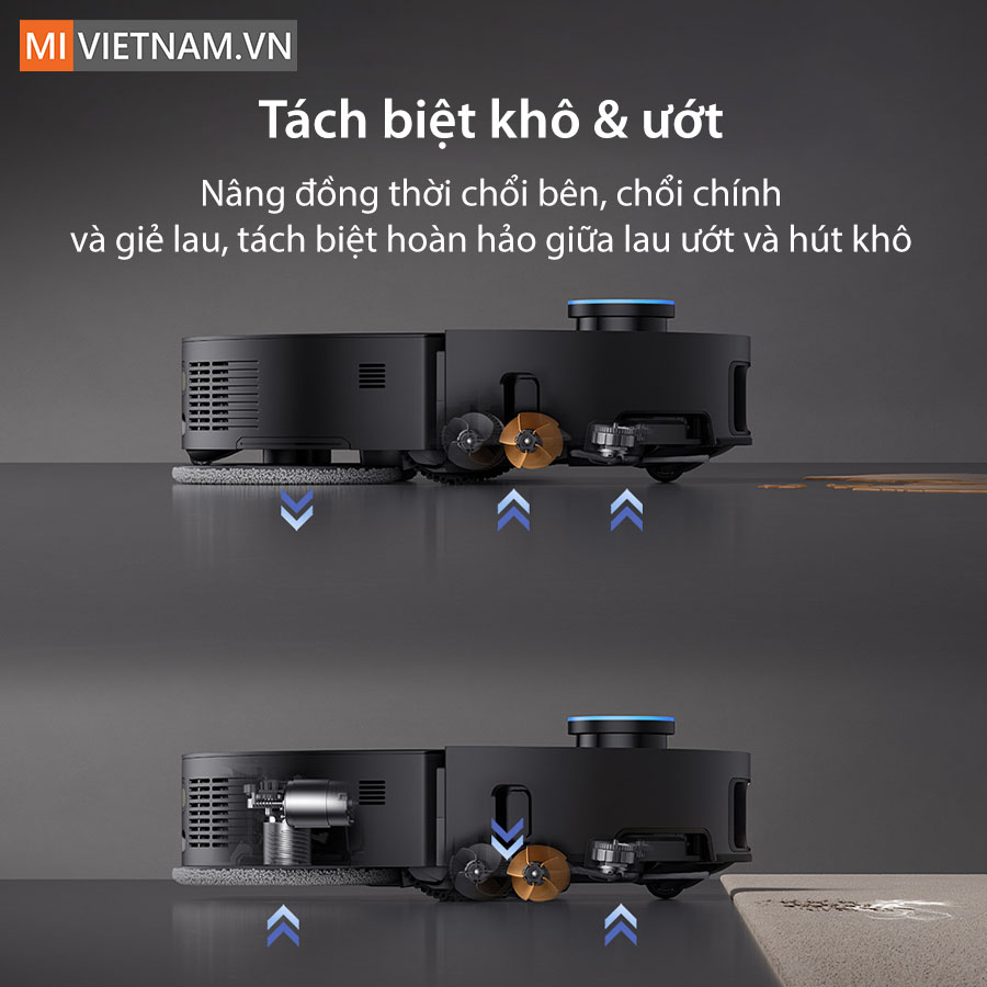 Công nghệ triple-lifting system có trên Dreame X50 Pro Ultra cho phép nâng đồng thời chổi bên, chổi chính và giẻ lau, giúp robot phân tách hoàn hảo giữa chế độ lau và hút. Nhờ đó, robot có thể di chuyển mượt mà qua các bề mặt khác nhau như thảm, sàn gỗ, gạch,… mà không gây ẩm ướt hoặc vệt nước. Khi phát hiện ra khu vực bẩn nặng, robot sẽ tự động lau lại lần hai, khi gặp bụi hạt lớn, robot sẽ tăng cường quét lại để đảm bảo sàn luôn sạch sẽ, từng chi tiết nhỏ đều được xử lý triệt để.
